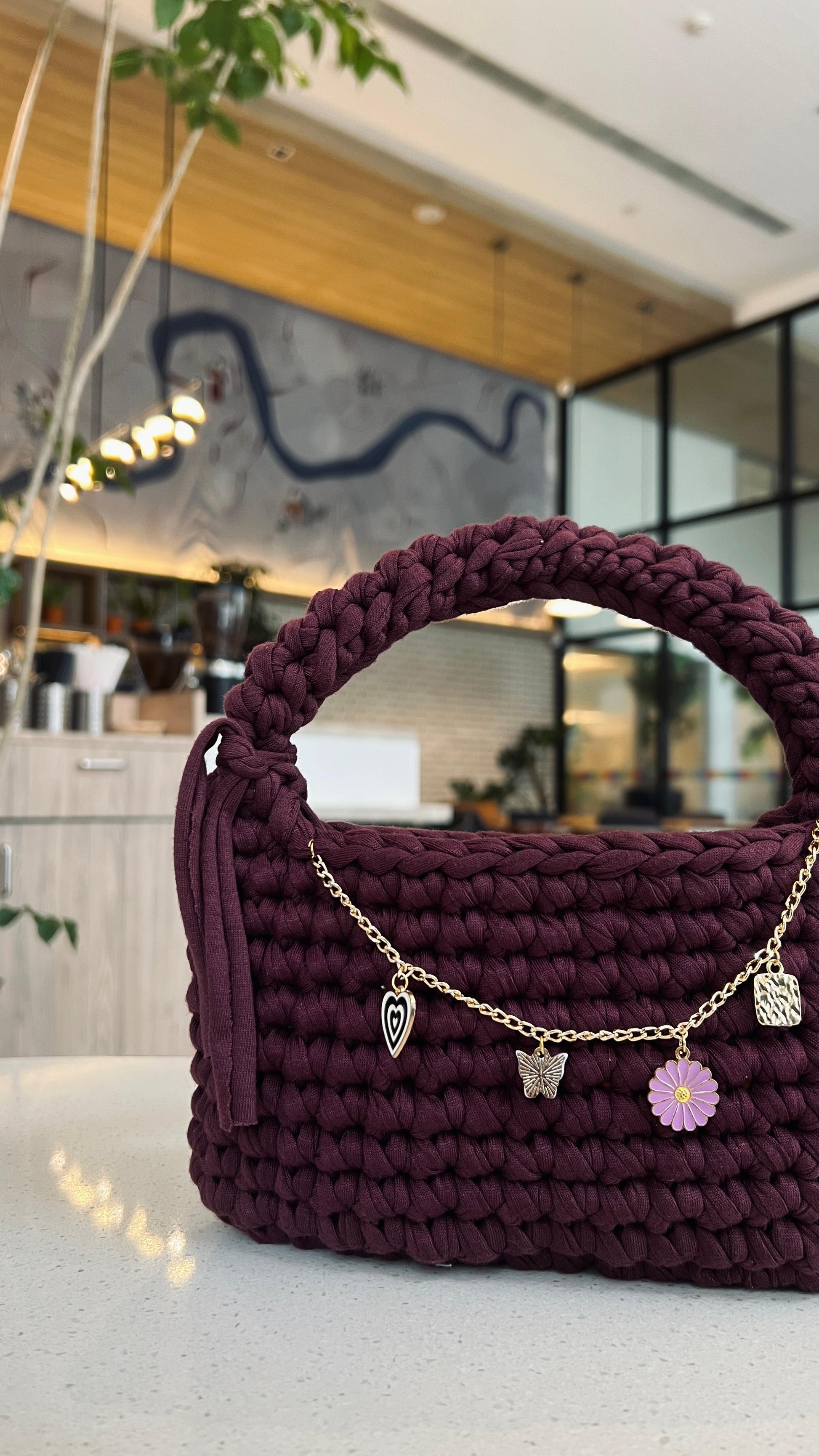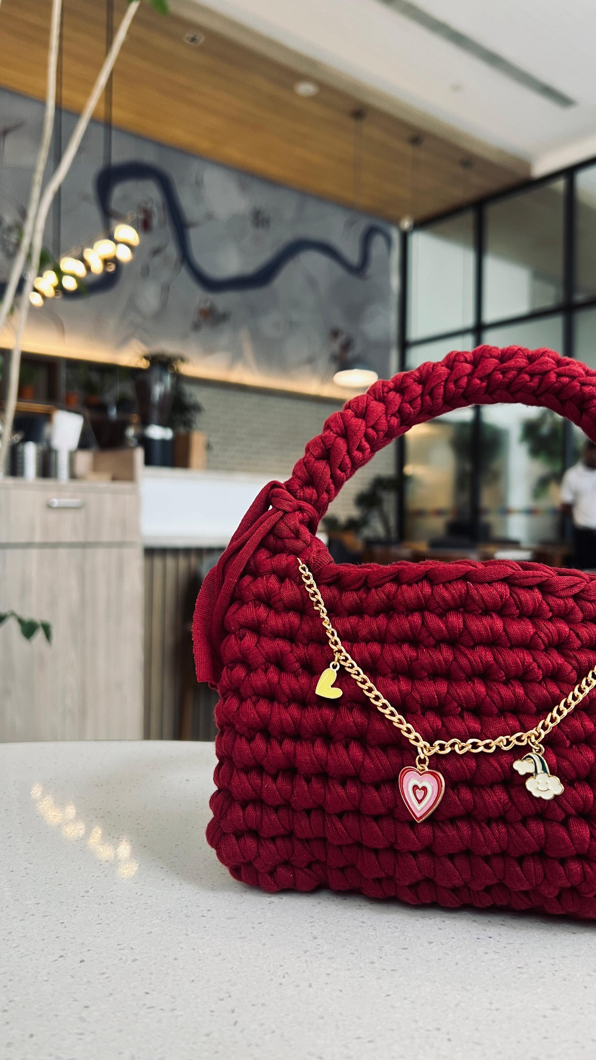 Bring charm and chic elegance to your everyday style with our handcrafted Charm Loop Mini Crochet Handbag. Made with premium yarn and adorned with a delicate charm chain, each bag offers a blend of softness, structure, and sparkle. Whether you're drawn to the gentle Lavender, cozy Mauve, playful Sky Blue, bold Maroon, or deep Crimson Red, there's a color for every mood and moment. Perfect for casual outings, gifting, or adding a handmade statement piece to your wardrobe.